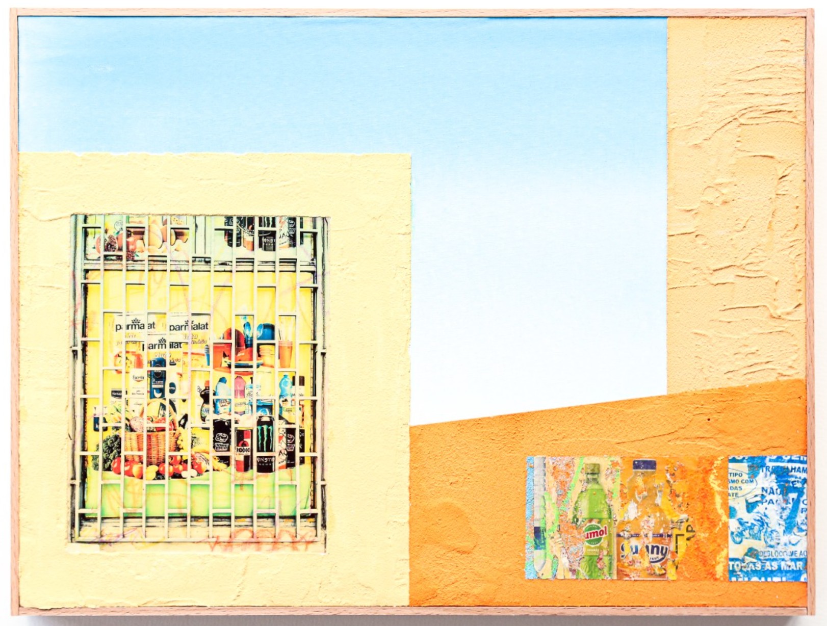 Œuvre de la série “Wall Study”. Aquarelle, acrylique, acétate, crayon de couleur, pastel à l'huile, coupures de magazines de supermarché, plâtre et sable sur toile dans un cadre fabriqué par l'artiste (41 x 31 cm).