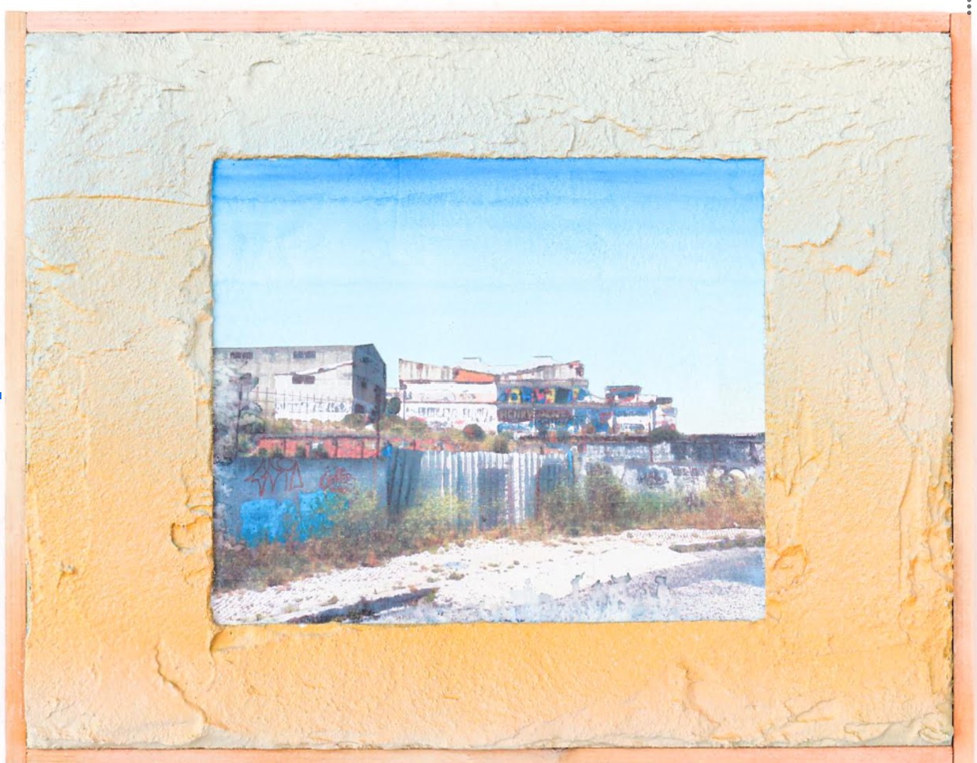 Aquarel, gesso, spuitverf en inkjetprint op canvas in een frame gemaakt door de kunstenaar (40 x 38 cm).
