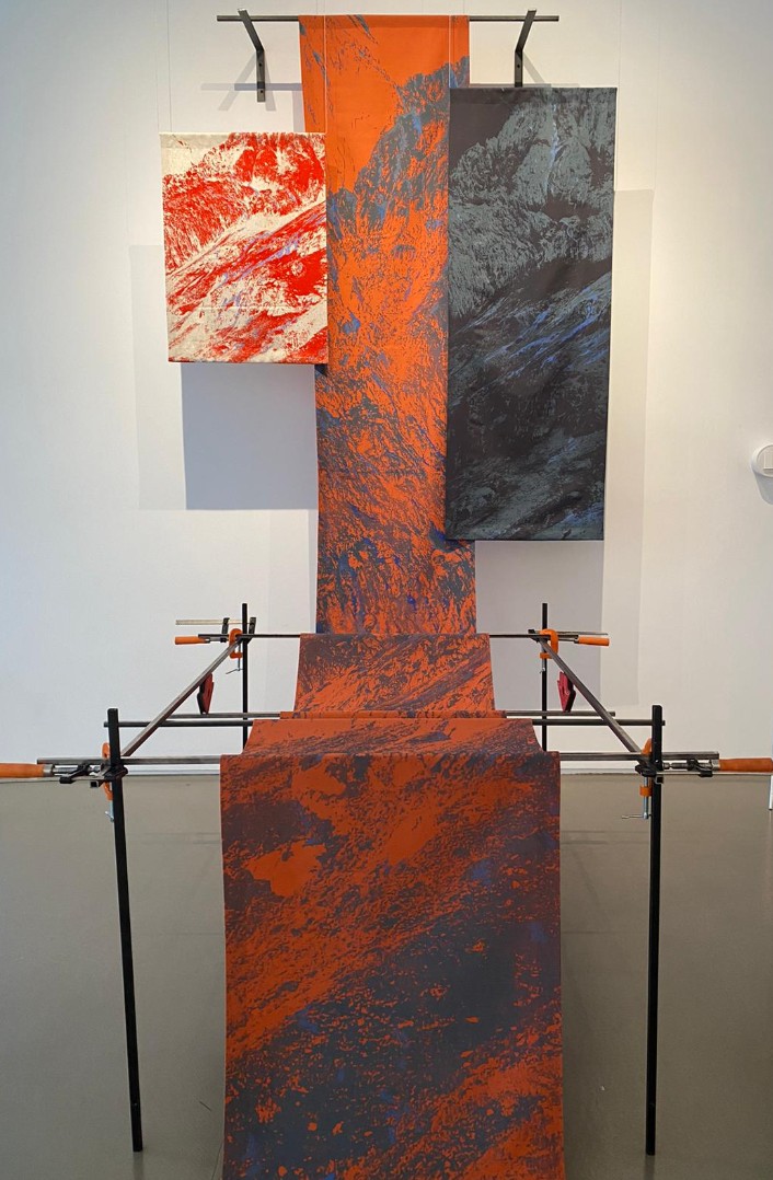 Installatie met 3 zeefdrukken op stof, ijzeren structuur en slotenmakersklem.